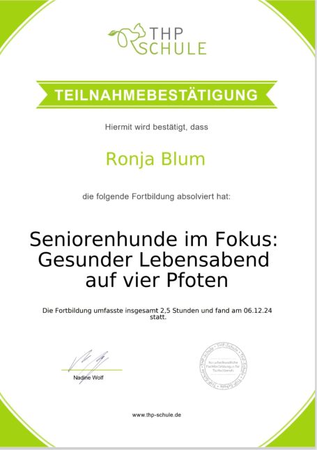 Ich bin Ronja Blum, Tierpsychologin und Tierernährungsberaterin für Hund & Katze. Tiere begleiten mich seit meiner Kindheit, und mit ihnen wuchs die Leidenschaft, ihr Wohlbefinden aktiv zu fördern.